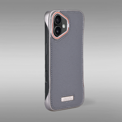 This is a protective case designed for the iPhone 16. The case features a stylish and modern design with a gray leather-like back panel, complemented by detailed stitching for a premium look. It has a raised camera cutout with metallic accents and an additional red trim for added aesthetic appeal.
